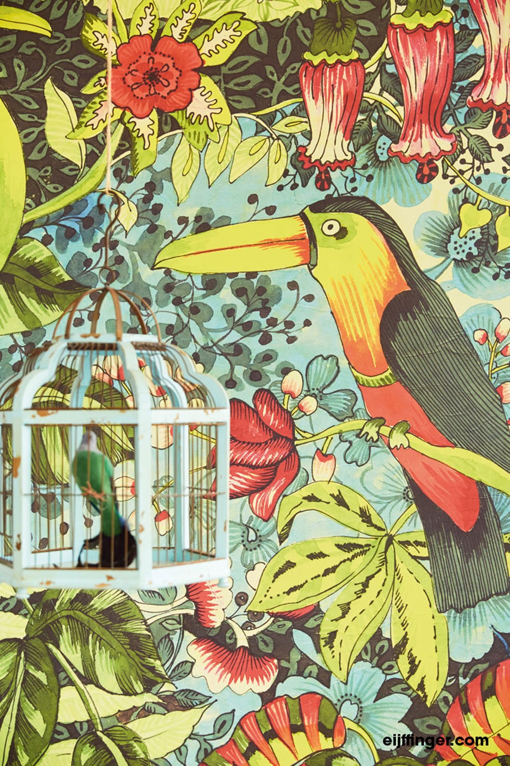 Ptáci a tropické rostliny na pestrobarevné kreslené obrazové tapetě.