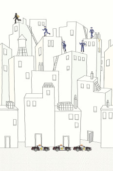 Černo-bílé domy - policejní zásah na obrazové tapetě s vliesovým podkladem.