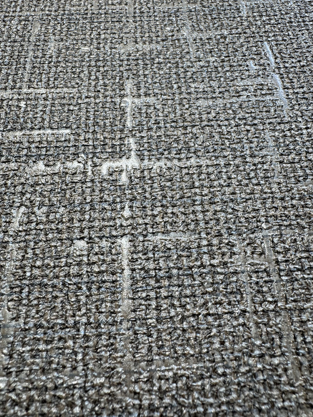 Luxusné vliesové tapety s vinylovým povrchom - štruktúra sivej/ sivo-béžovej hrubšej textílie s presvitajúcim strieborným podkladom. Farby a odlesky na tapete sa menia podľa dopadu svetla.
