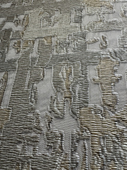 Luxusná vliesová tapeta s vinylovým povrchom - podklad imitácia jemnej béžovej pololesklej textílie, textúra tapety tvorená krémovými a svetlosivými metalickými "vláknami".