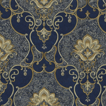 Luxusná modrá vliesová tapeta s bohatým plastickým ornamentálnym zlatým vzorom. Šírka role 1,06 m.