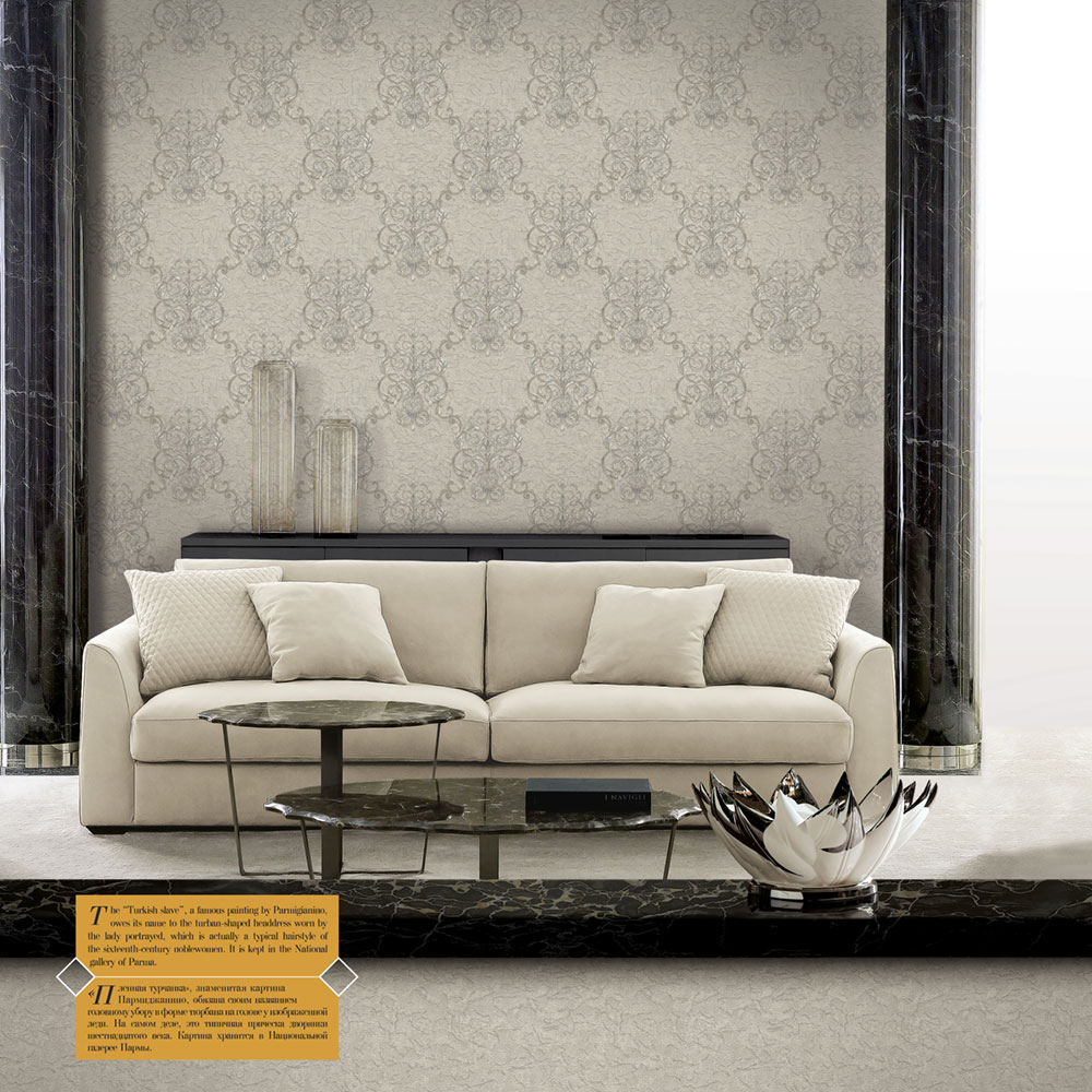 Šírka role 1,06 m. Luxusné vliesové tapety s vinylovým povrchom inšpirované krásou talianskych historických palácov – bohatý zámocký vzor, plastická textúra v metalických odtieňoch šedo-strieborných farieb. Ľahko ich skombinujete s príslušnými tapetami.