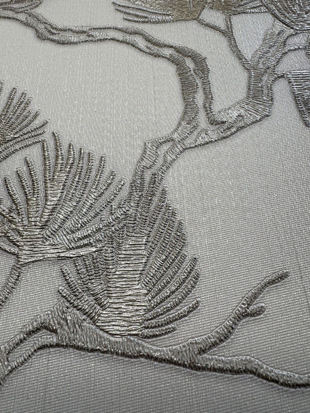 Luxusná vliesová tapeta s vinylovým povrchom, biely podklad, sivo-strieborné vetvičky stromu.