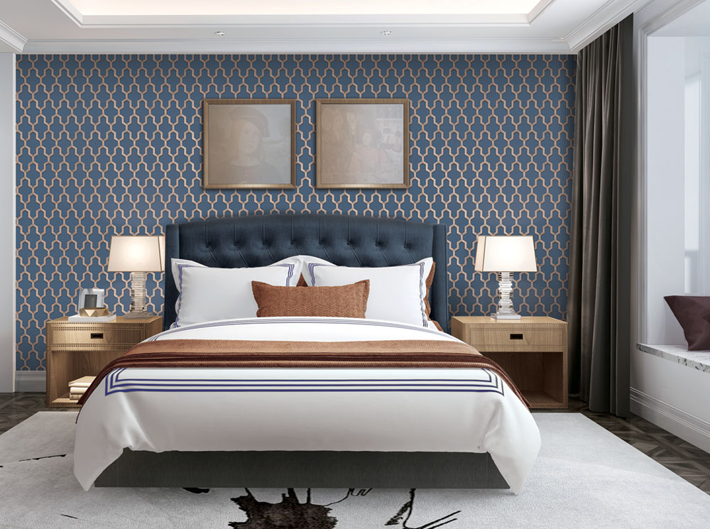 Hnedo-béžový vyšívaný vzor v štýle Art Deco na vliesovej tapete s modrým podkladom.