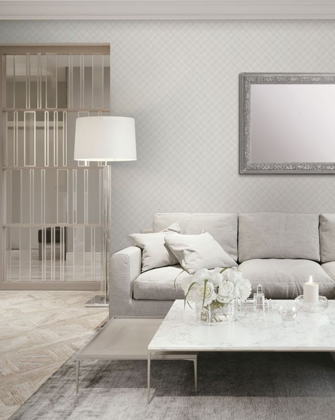 Svetlá vliesová tapeta v bielo-sivom odtieni s jemným perlovým leskom a plastickým geometrickým vzorom.