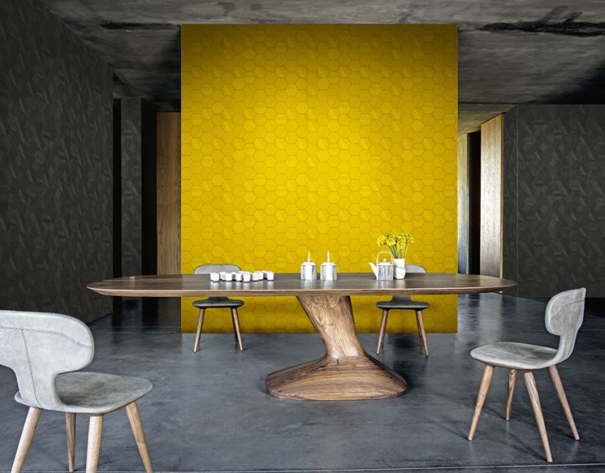 Šírka rolky 0,7m. S touto kolekciou vnesiete do interiéru jedinečnosť a eleganciu. Luxusná vliesová tapeta s vinylovým povrchom, dizajn a textúra uhlíkových vlákien, vzor hexagony, efektné striedaní matu a pololesk. Odtiene sivo-hnedej s jemným kovovým leskom, škáry zlaté pololesk.