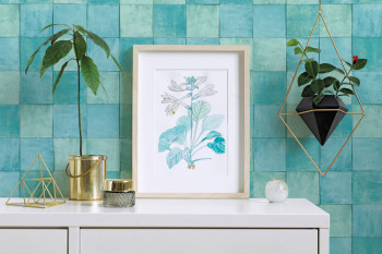 Luxusná vliesová tapeta s hrubou štruktúrou a vinylovým povrchom so zeleno-tyrkysovým dekorom. Rozmery obkladu približne 10,5x10,5 cm.