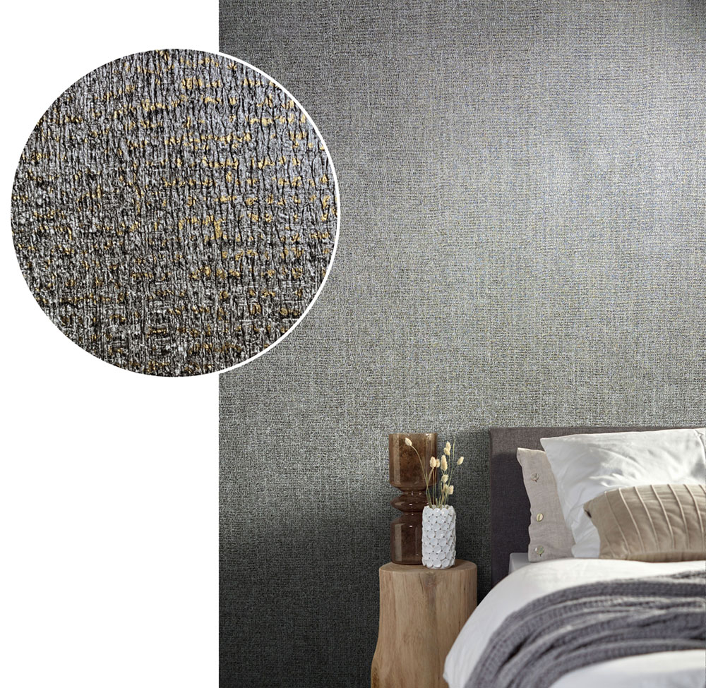 Luxusná sivo-zlatá vliesová tapeta na stenu, imitácia hrubej látky.