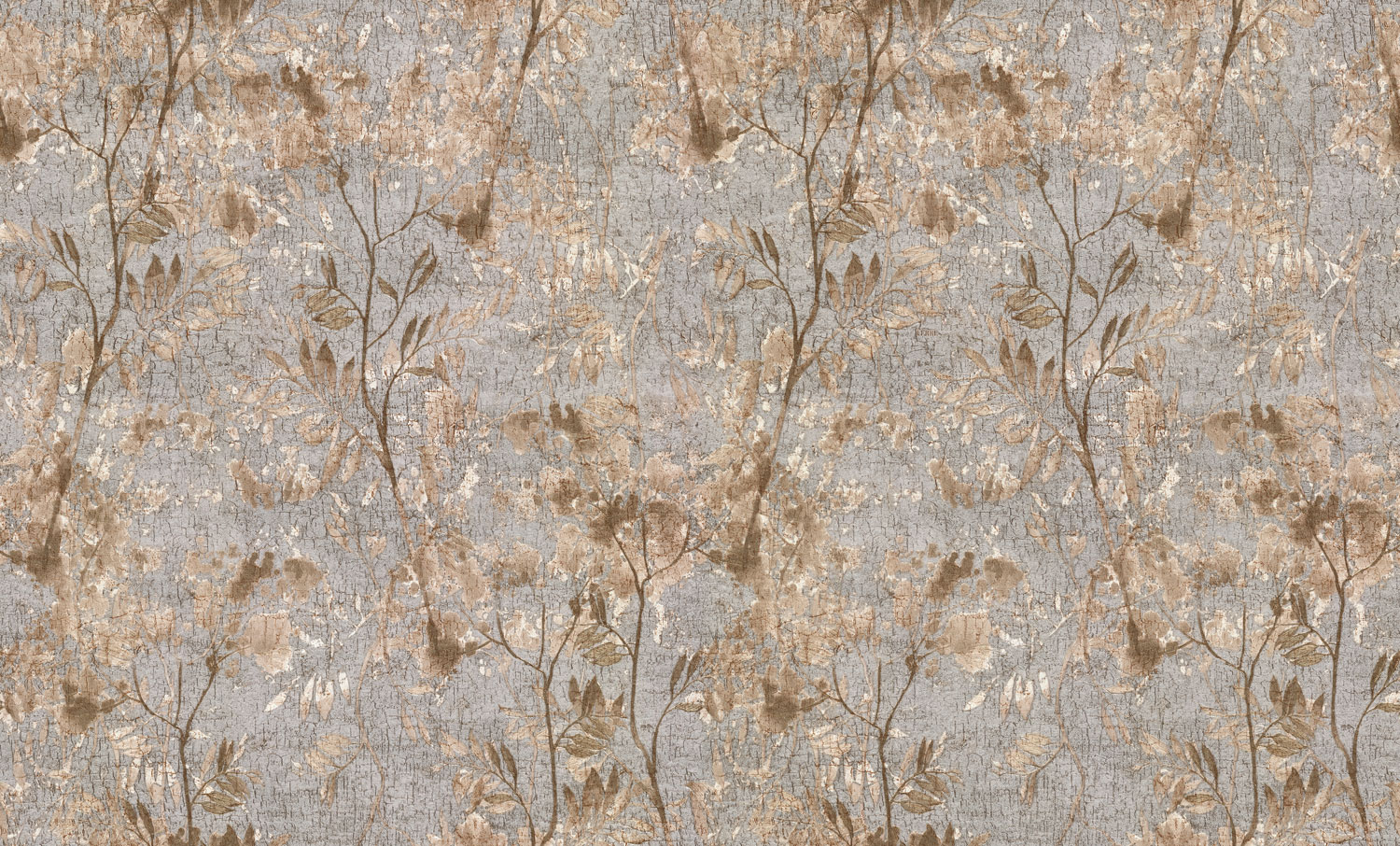 Luxusná metalická strieborno-bronzová vliesová tapeta na stenu so vzorom vetvičiek s listami.