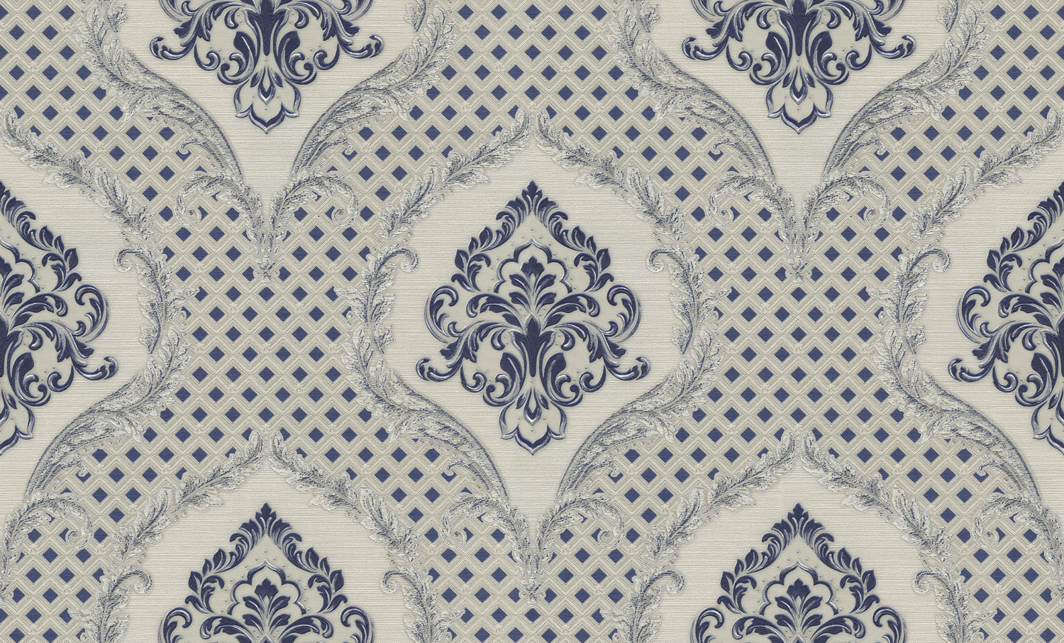 Luxusná metalická modro-strieborná zámocká vliesová tapeta s ornamentami na geometrickom podklade.