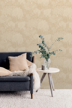 Okrová vliesová tapeta s vinylovým povrchom, zlaté a bronzové motívy stromov, listov. Foto interiéru je iba ilustračné - odlišné farby.