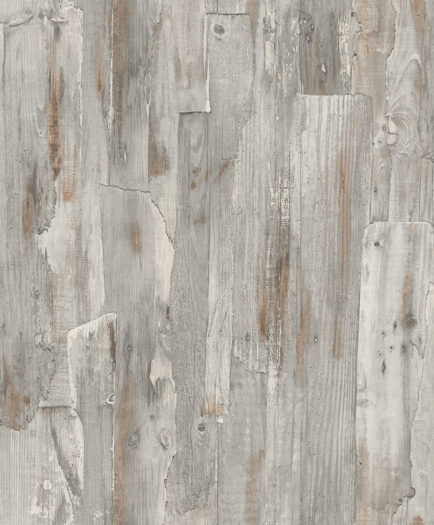 Vliesová tapeta na stenu imitujúca oprýskané drevo, palubovky v odtieňoch sivej a hnedej.