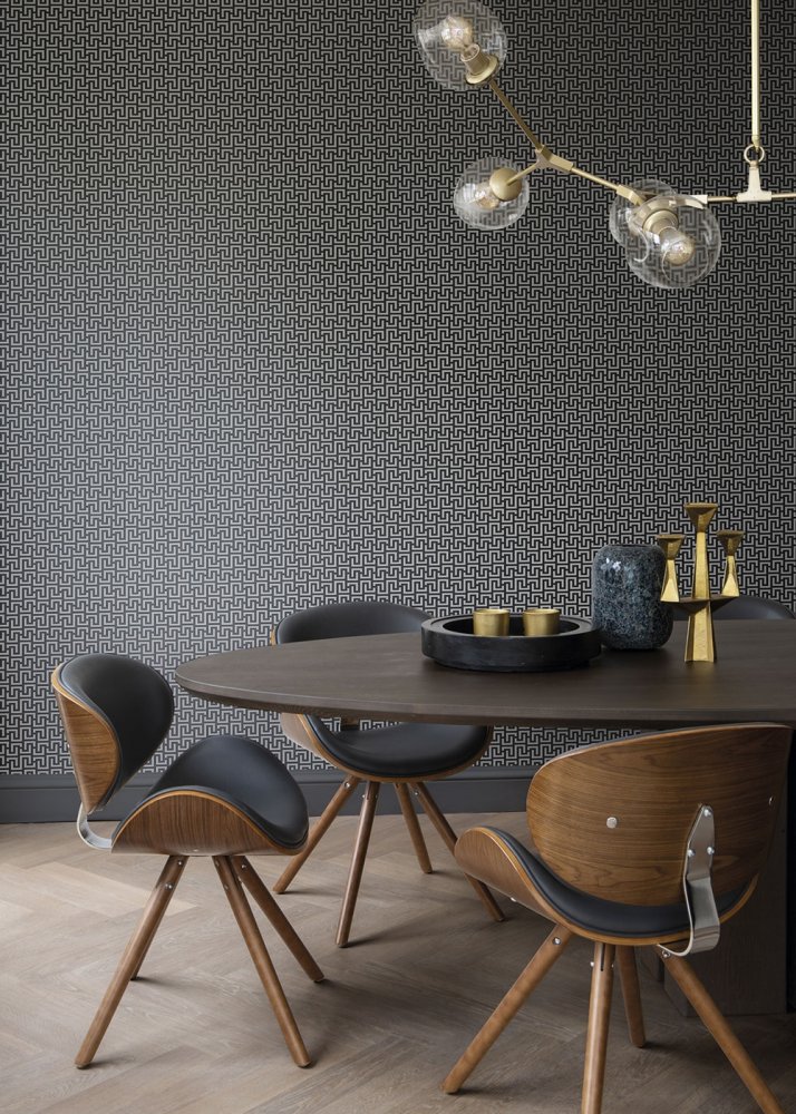 Vliesová tapeta s dizajnom inšpirovaným gréckym meander vzorom. Kombinácia farieb na tapete - čierna, strieborná. Ľahko skombinujete so súvisiacimi tapetami.