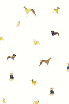 Krémová vliesová tapeta na stenu, motívy psíkov v odtieňoch okrovej, hnedej, modrej a sivej.