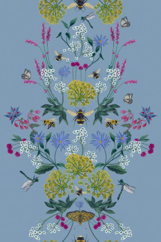 Modrá vliesová tapeta na stenu, motívy lúčnych kvetov, motýľov, vážok a včiel.