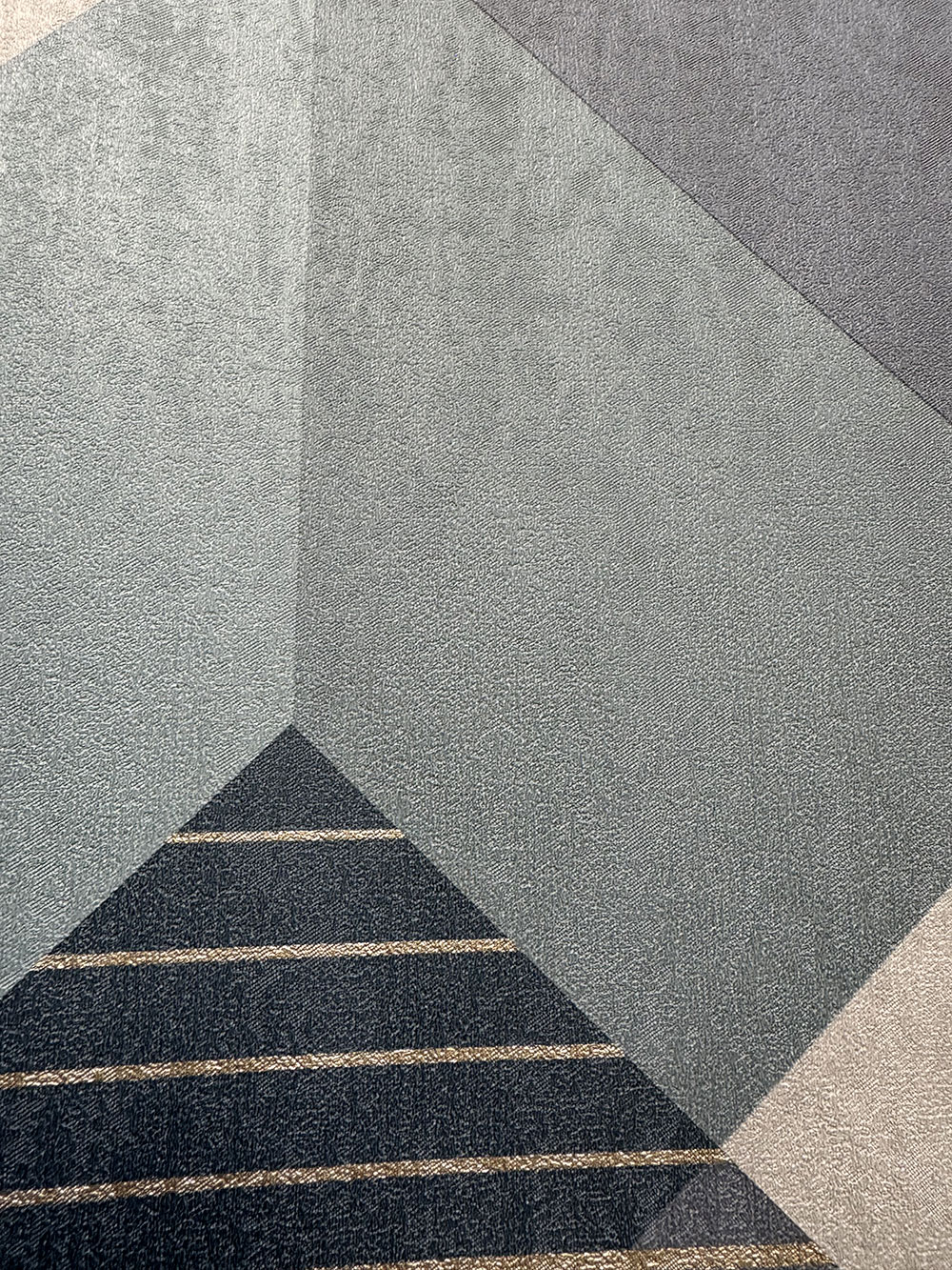 Vliesová tapeta na stenu, geometrický vzor v odtieňoch modrej a sivej, línie vo farbe svetlého zlata.
