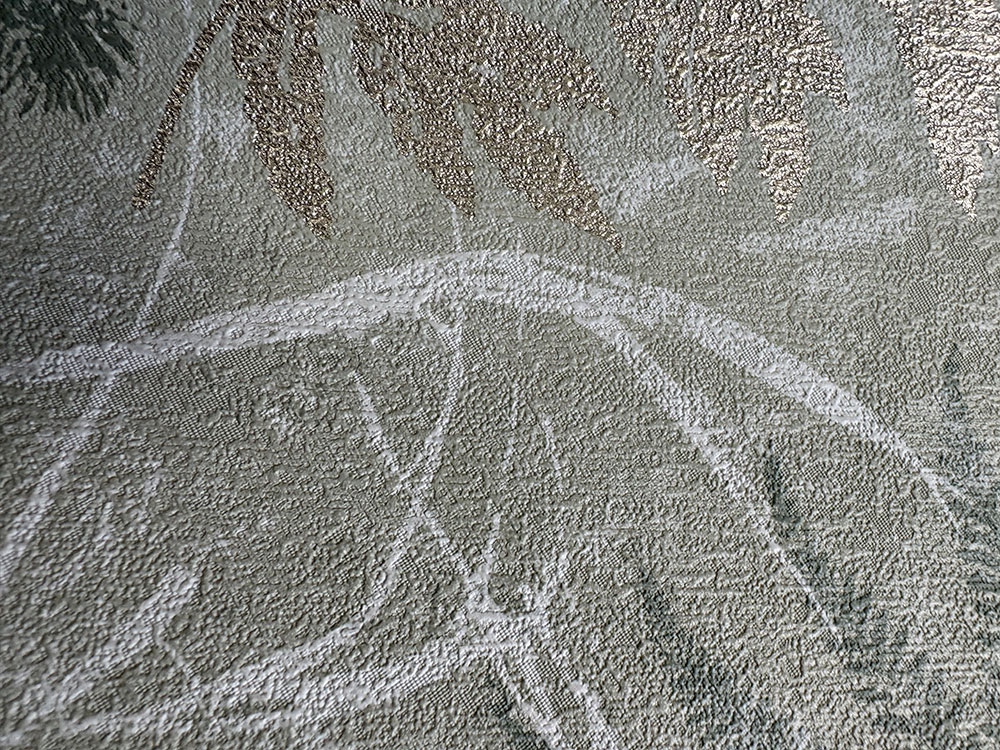 SIvá štruktúrovaná vliesová tapeta na stenu, imitácia štukovej omietky, dekór listov a kvety v odtieňoch sivej a metalickej zlatej.