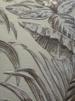 Luxusná vliesová tapeta s vinylovým povrchom, svetlo béžový podklad s jemným pololeskom, metalické textúry v odtieňoch hnedej, hnedo-zlatej. Farby a odlesky sa menia podľa dopadu svetla na tapetu.