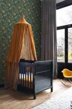 Tmavozelená hladká vliesová tapeta na stenu, detské vzory prírody a zvieratiek v odtieňoch hnedej a zelenej.