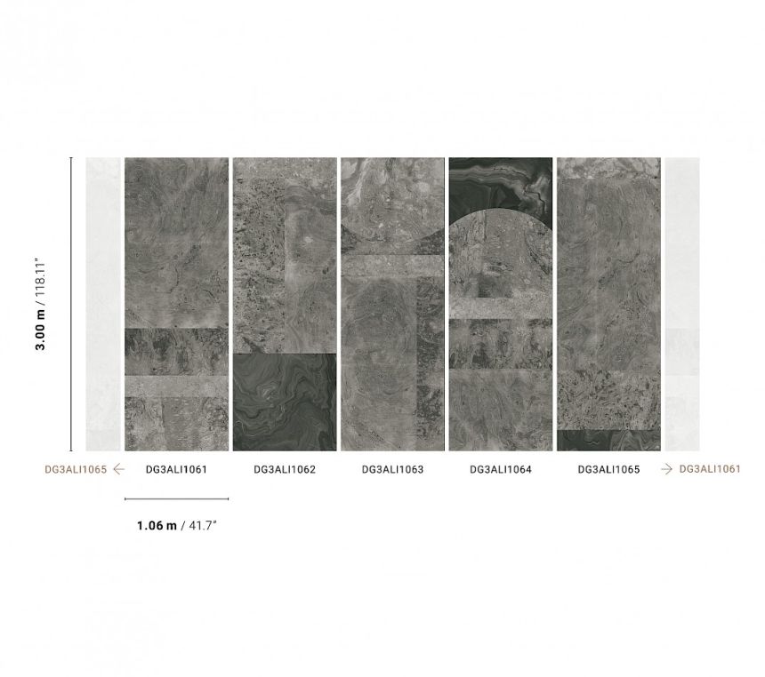 Vliesová obrazová tapeta na stenu, imitácia sivého mramoru. Pre väčšiu šírku je možné kombinovať s fototapetami DG3ALI1061, DG3ALI1062, DG3ALI1063 a DG3ALI1064 - pozri fotografiu.
