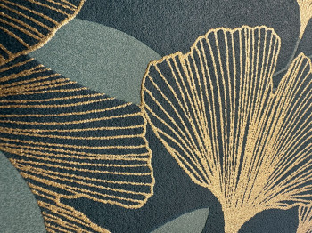 Čierna vliesová tapeta s vinylovým povrchom, motívmi zlatých a zelených/khaki listov Ginkga.