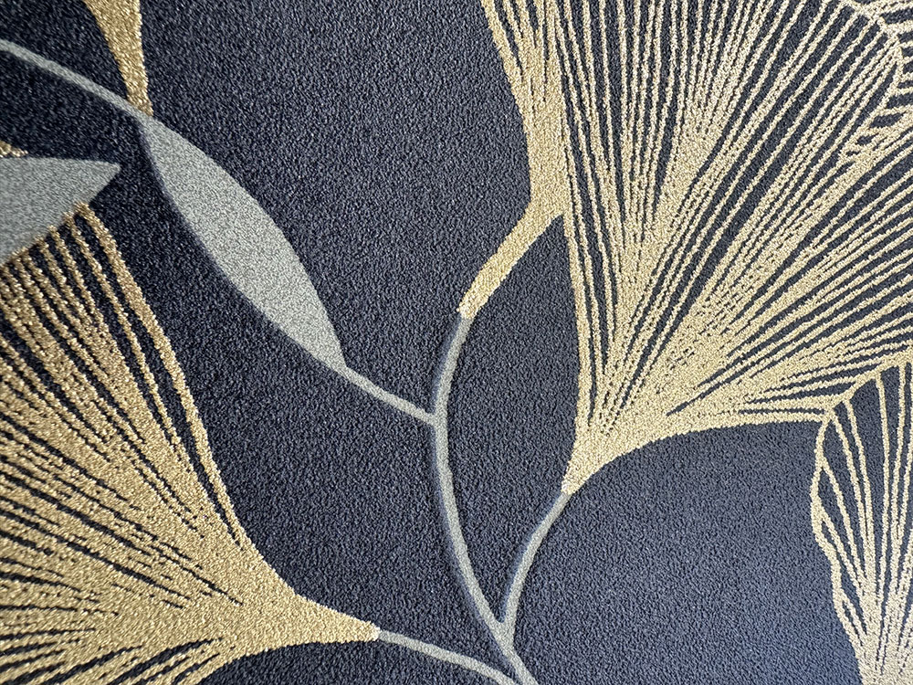 Zelená vliesová tapeta s vinylovým povrchom, motívmi zlatých listov Ginkga.