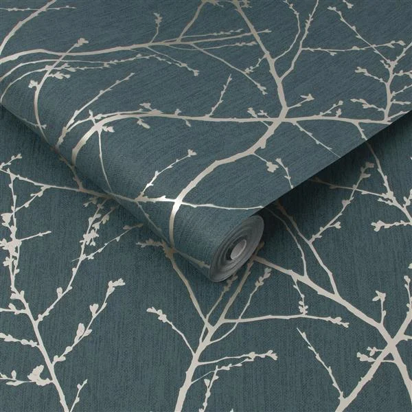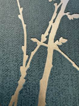 Zelená plastická vliesová tapeta na stenu, látková textúra, hladké metalické vetvičky, svetlé zlato.