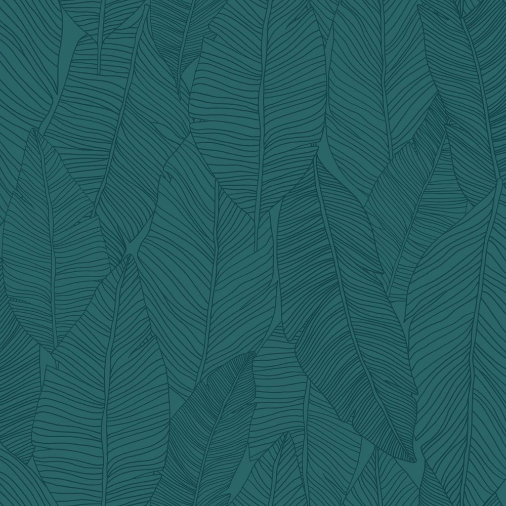 Hladká, tyrkysová, vliesová tapeta na stenu, obrysy listov.