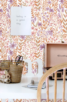 Hladká biela vliesová tapeta na stenu, vzor lúčnych kvetov v odtieňoch hnedej, béžovej, ružovej, fialovej a tehlovej.