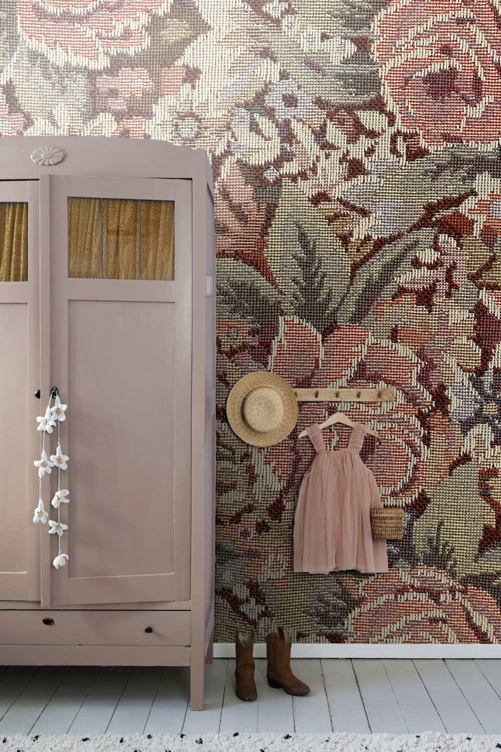 Kvetinová vliesová tapeta na stenu, odtiene staroružovej, vínovej a béžovej, vzor evokuje staré tapisérie.
