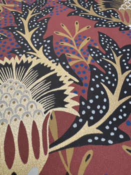 Vínová vliesová tapeta na stenu, netradičný kvetinový vzor inšpirovaný africkou batikou, zlaté kvety a časti listov, ďalšie farby - modrá, čierna, hnedá.