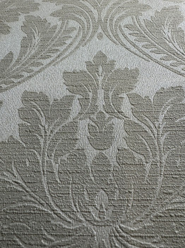 Béžová vliesová tapeta so zámockým damaškovým vzorom, látková textúra, podklad s jemným pololeskom.