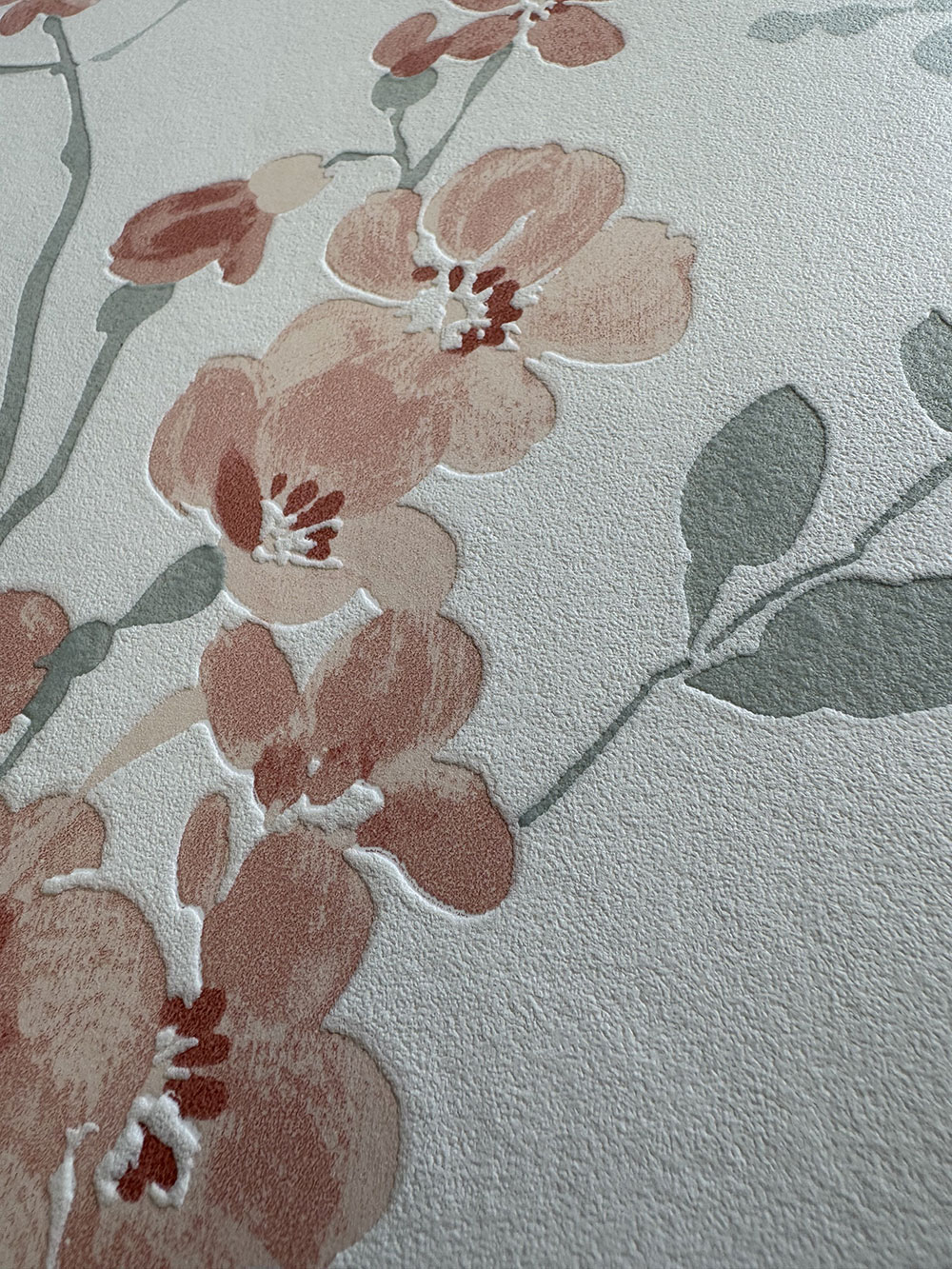 Krémová vliesová tapeta na stenu, prelisovaný kvetinový vzor v odtieňoch zelenej a ružovej.