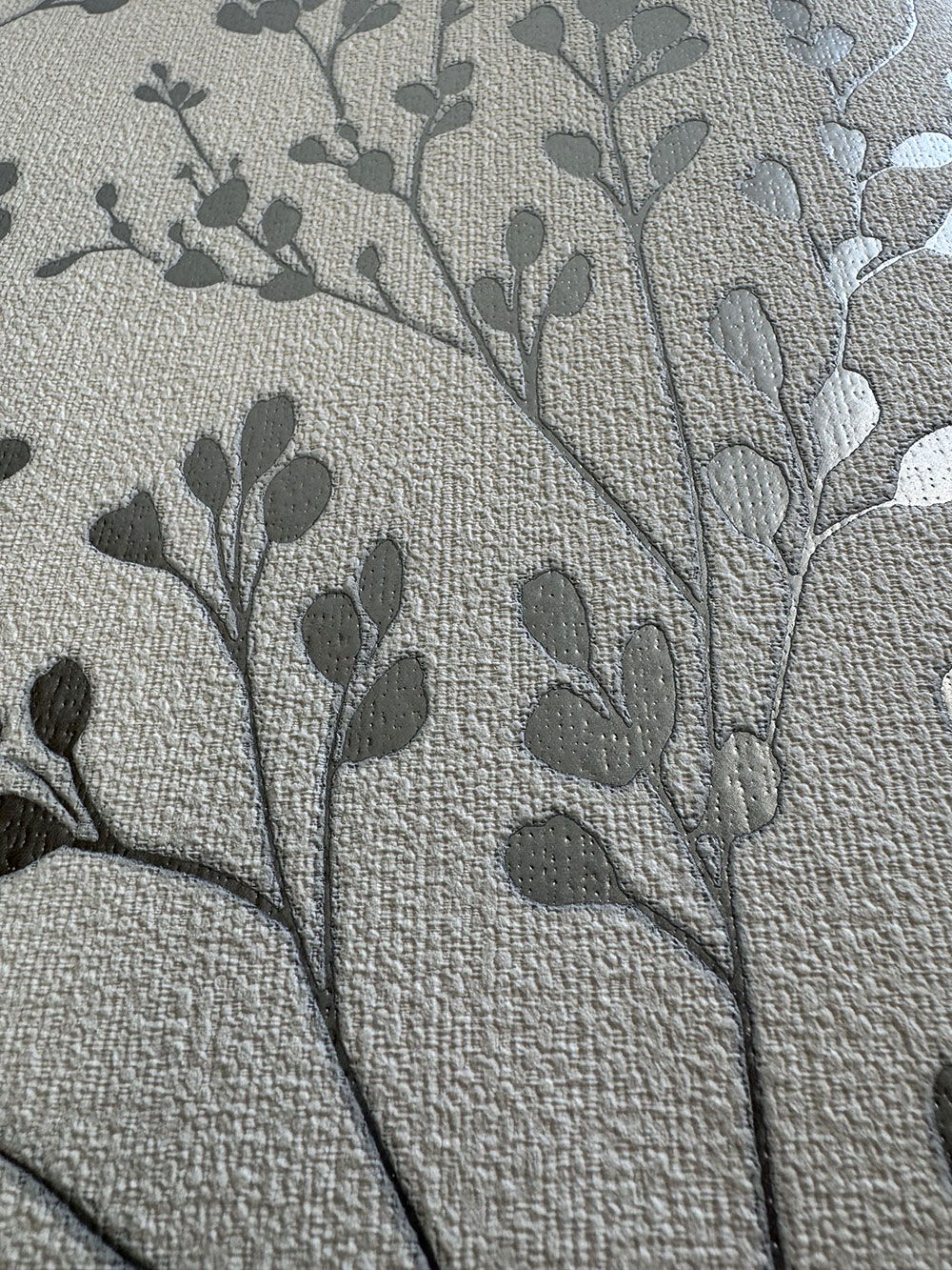 Štruktúrovaná biela vliesová tapeta na stenu, prelisované strieborné vetvičky.