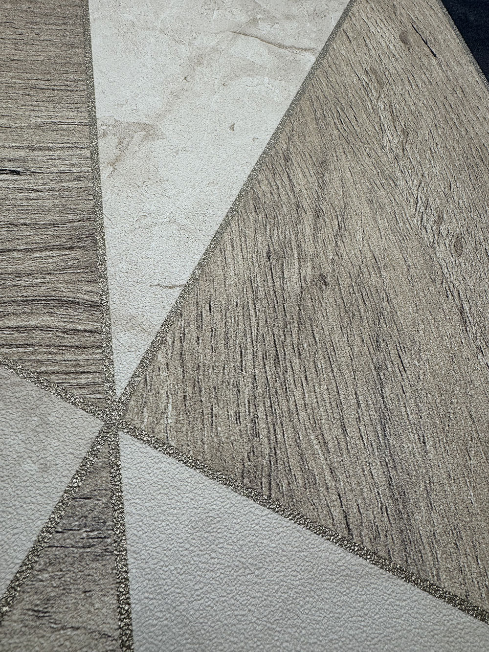 Geometrická vliesová tapeta na stenu, odtiene hnedej, béžovej a sivočiernej. Motív dreva a mramoru, béžové metalické obrysy.