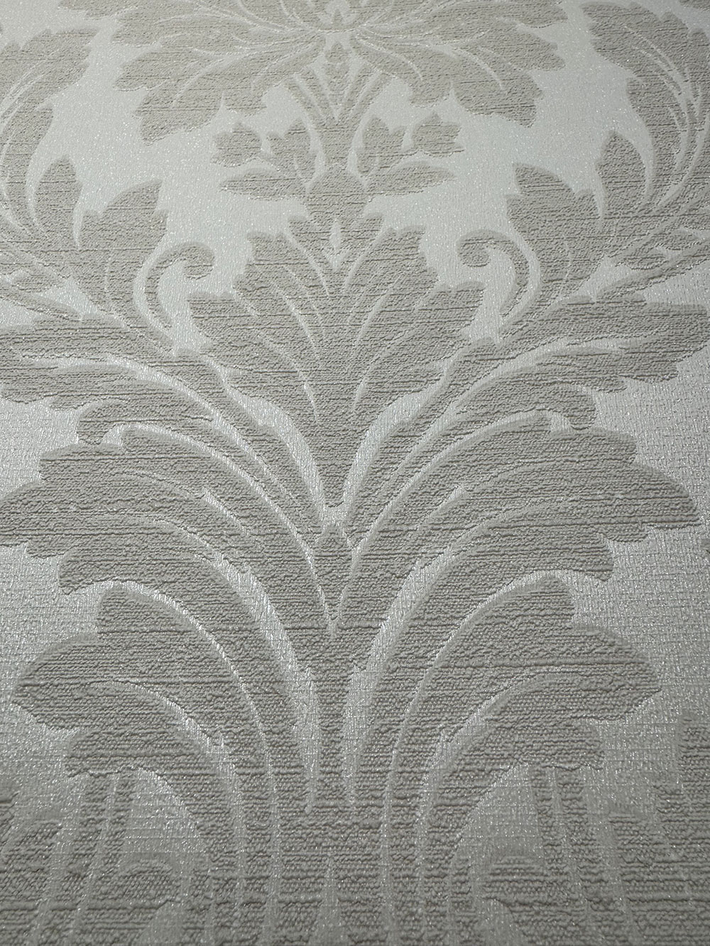 Vliesová tapeta so zámockým damaškovým vzorom, látková textúra. Pololesklý podklad, vzor v odtieni taupe / sivo-béžová.