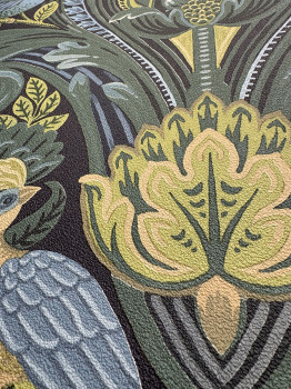 Originálna vliesová tapeta na stenu - ornamentálne prírodné vzory a vtáky; odtiene zelenej, modrej a čiernej, krupičková textúra.
