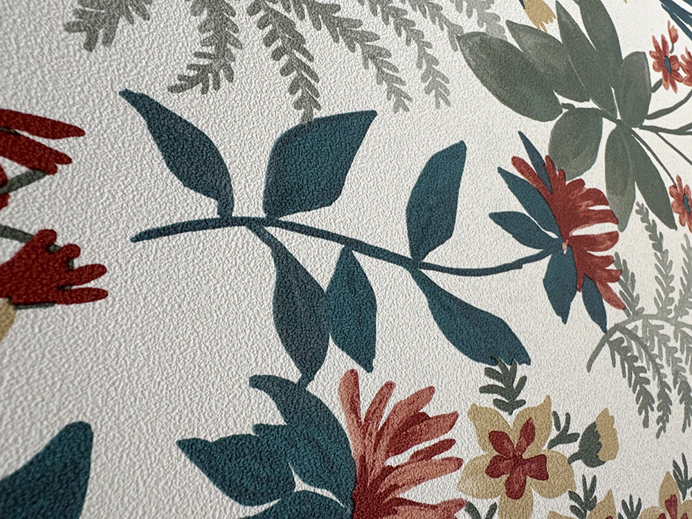Vliesová tapeta na stenu, motívy kvetov v odtieňoch zelenej, tyrkysovej, tehlovo červenej a béžovej. Jemná krupičková textúra.