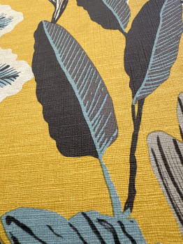 Okrová vliesová tapeta na stenu, motívy listov v odtieňoch tyrkysovej, sivej, hnedej a béžovej.