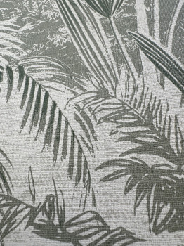 Vliesová tapeta na stenu, motívy listov a paliem v odtieňoch zelenej.
