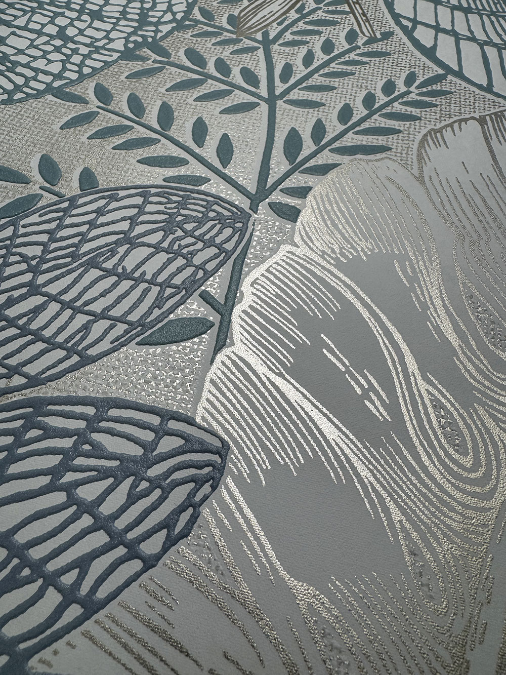 Plastická vliesová tapeta na stenu, sivý podklad, listy modré, zelené a metalické.