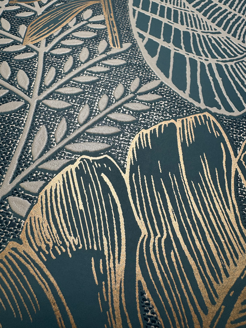 Plastická vliesová tapeta na stenu, zelený podklad, listy béžové a zlaté.