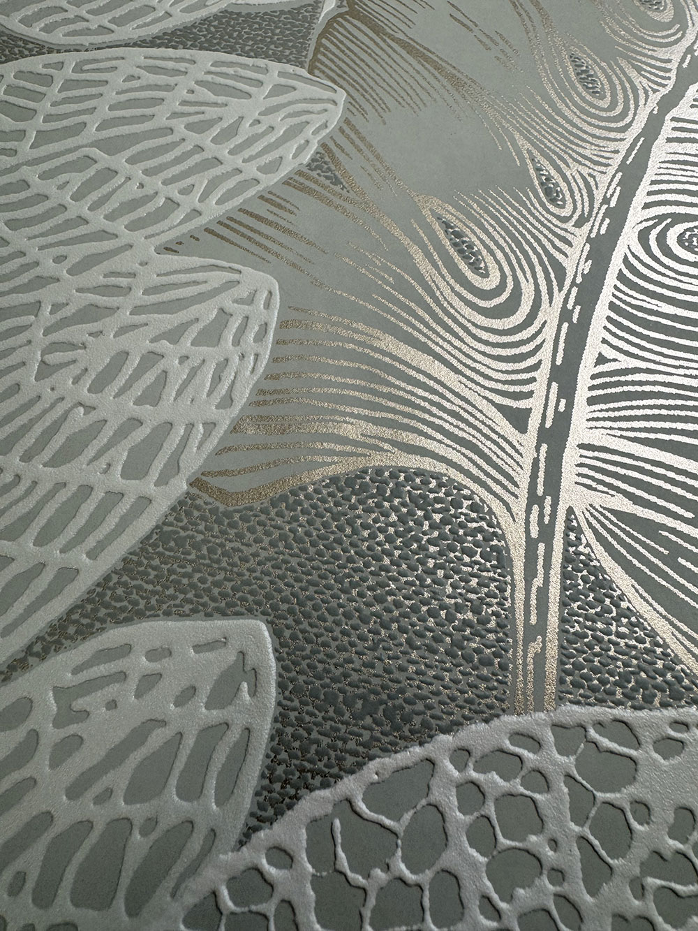 Plastická vliesová tapeta na stenu, zeleno-zlatý podklad, listy zelené, sivé a metalické - svetlé zlato.