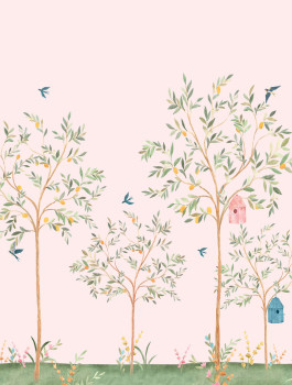 Vliesová tapeta na stenu, motív stromčekov, vtáčích búdok a vtáčikov, odtiene ružovej, zelenej, hnedej, žltej a modrej.