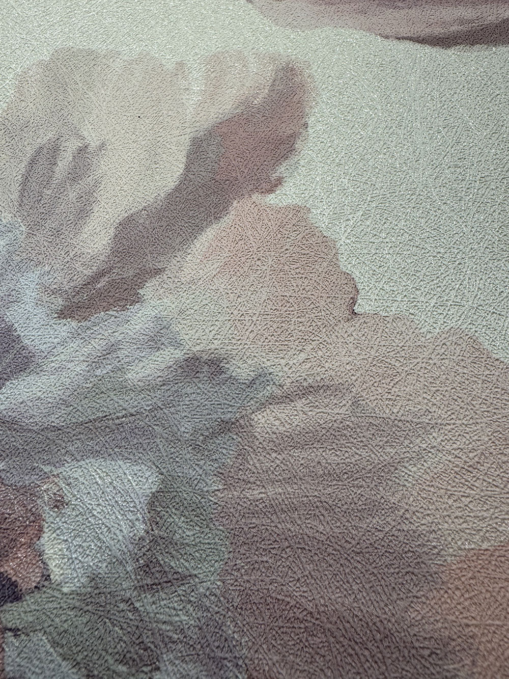 Vliesová tapeta s vinylovým povrchom, kvetinový vzor v odtieňoch bielej, sivej, ružovej, zelenej a fialovej - jemná vláknitá textúra.