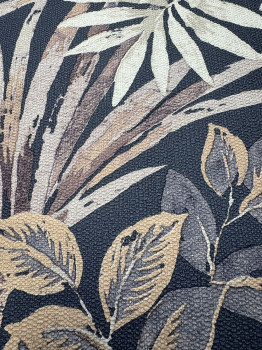 Vliesová tapeta s vinylovým povrchom, imitácia hrubšej látky, motívy listov v odtieňoch temnej modrej, hnedej, béžovej a vínovej.