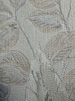 Vliesová tapeta s vinylovým povrchom, imitácia hrubšej látky, motívy listov v odtieňoch zelenej a sivo-béžovej.