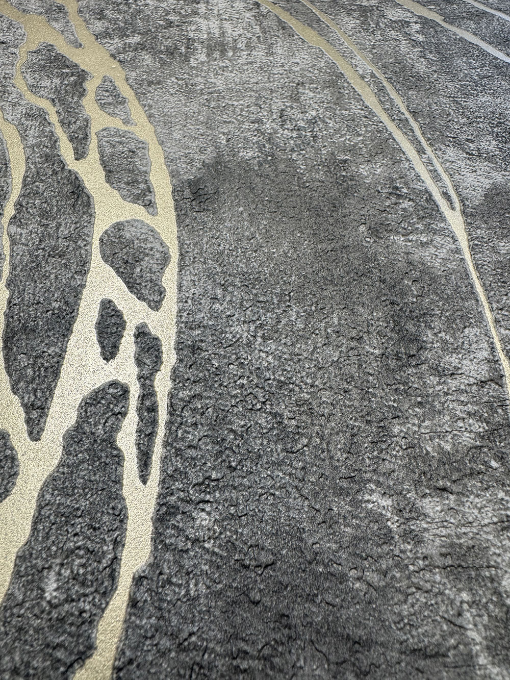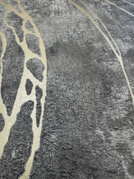 Vliesová tapeta s vinylovým povrchom, imitácia štuku/betónu v odtieňoch tmavosivej, prelisované zlaté línie.