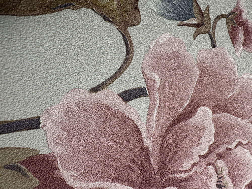 Vliesová tapeta s vinylovým povrchom, béžový podklad, kvety v odtienoch ružovej, hnedej a sivo-modrej.