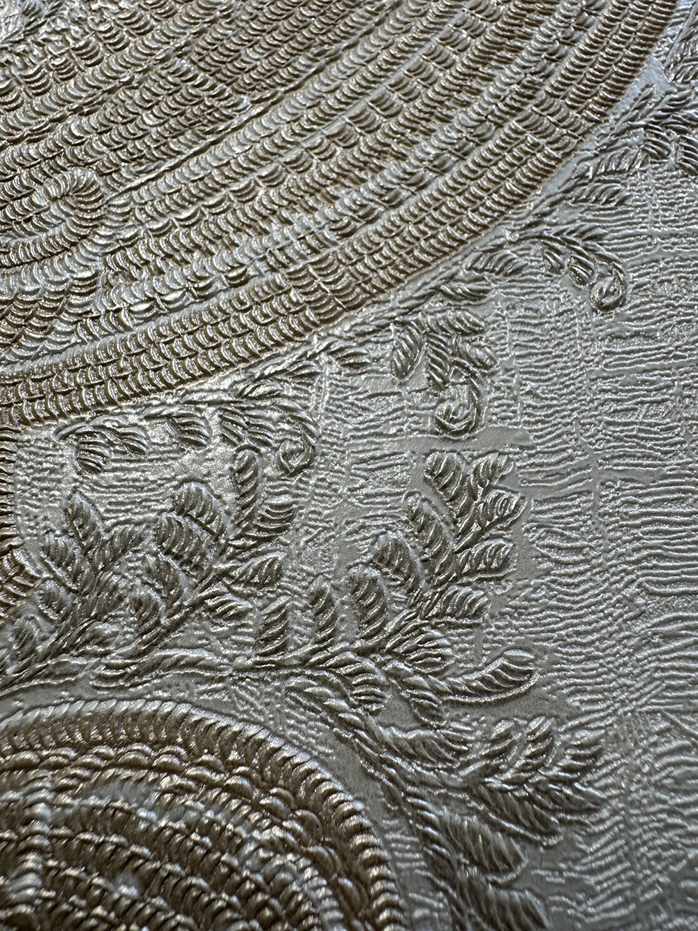 Luxusná vliesová tapeta s vinylovým povrchom, zámocký vzor v odtieňoch pololesklej krémovej, béžovej a zlato-béžovej.
